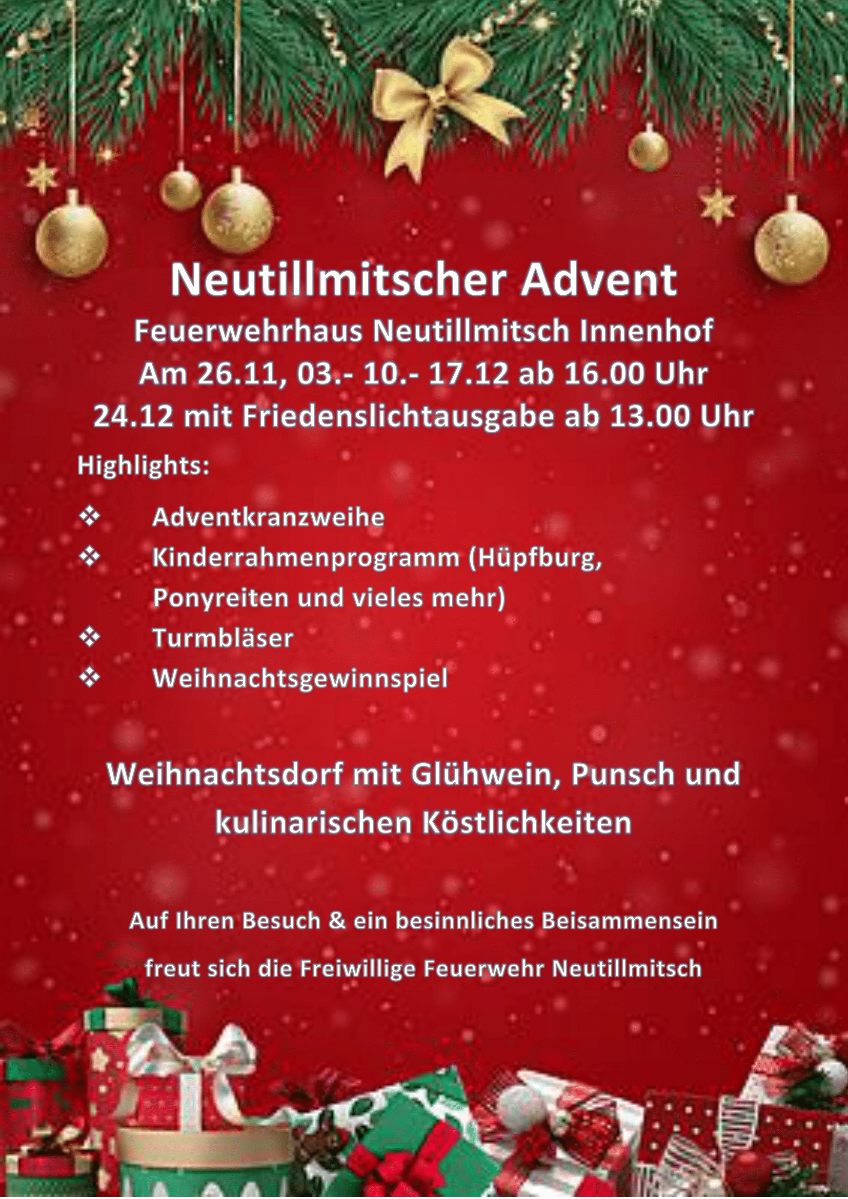 Vom 26.11 bis zum 24.12 findet jeden Samstag ein kleiner Adventmarkt bei unserem Rüsthaus in Neutillmtisch statt. Um ein Kinderprogramm wurde sich ebenfalls gekümmert, deswegen gibt es eine Hüpfburg, ein kleines Weihnachtskino und zudem köstliche Kleinigkeiten. Beim Weihnachtsgewinnspiel gibt es viele schöne Preise, ein vorbeischauen lohnt...